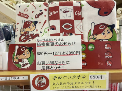12月1日よりカープ手ぬぐいタオルが880円から990円に値上げされます。