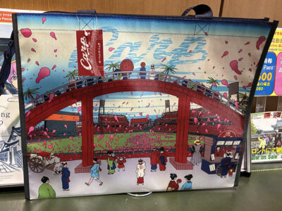マツダスタジアムのゲートブリッジ下からジェット風船が舞う、熱気あふれる風景が「浮世絵風」に描かれています。軽くてマチが広く、収納力も抜群!チャック付きなのも、遠方からお越しのお客様には嬉しいポイントですよね。